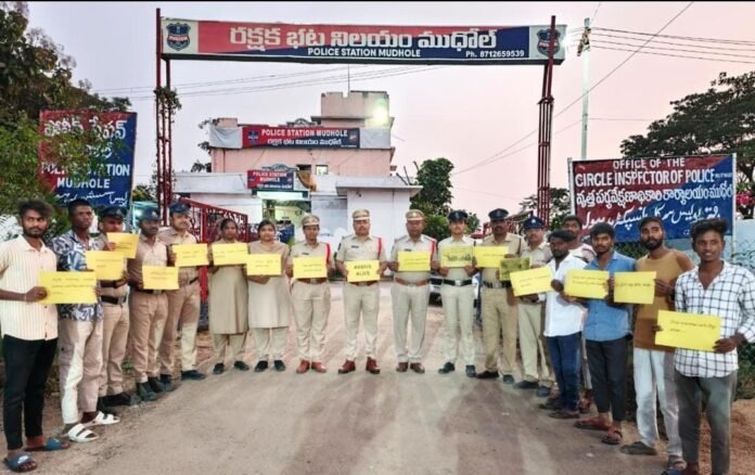 జనతా వార్. ముధోల్ నియోజకవర్గ కేంద్రమైన ముధోల్ పోలీస్ స్టేషన్లో సిఐ రవీందర్ నాయక్ ఆధ్వర్యంలో మంగళవారం సాయంత్రం ట్రాఫిక్ నిబంధనలపై ప్రచారం నిర్వహించారు. పోలీస్ శాఖ ఆధ్వర్యంలో ట్రాఫిక్ నిబంధనల గురించి వాహనదారులకు తెలిసే విధంగా పోలీసులు అరైవ్ అలైవ్, డిఫెన్స్ డ్రైవింగ్, పై అవగాహన కల్పిస్తున్నారు. ఇందులో భాగంగా పోలీసులు, యువకులు, జర్నలిస్టులతో కలిసి ట్రాఫిక్ నిబంధనలపై వీడియో తీయించారు. ట్రాఫిక్ నిబంధనలపై ప్రతి ఒక్కరికి అవగాహన కల్పించటానికి అన్ని చర్యలు తీసుకుంటున్నామని వారు తెలిపారు. ట్రాపిక్ నిబంధనలు పాటించాలని ఈ సందర్భంగా ఆయన కోరారు. ఈ కార్యక్రమంలో ఎస్ఐ బిట్ల పెర్సిస్, ఎస్ఐ 2గంగాధర్ , తదితరులు పాల్గొన్నారు.