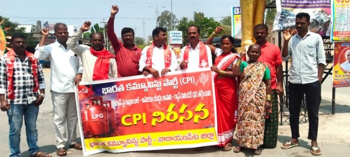 సిపిఐ నారాయణపేట జిల్లా సమితి ఆధ్వర్యంలో ఈరోజు ఇరాన్ పై చేస్తున్న యుద్ధానికి వ్యతిరేకంగా గ్యాస్ ధరల పెంపునకు నిరసనగా అంబేద్కర్ చౌరస్తాలో ముందు ధర్నా చేసి .